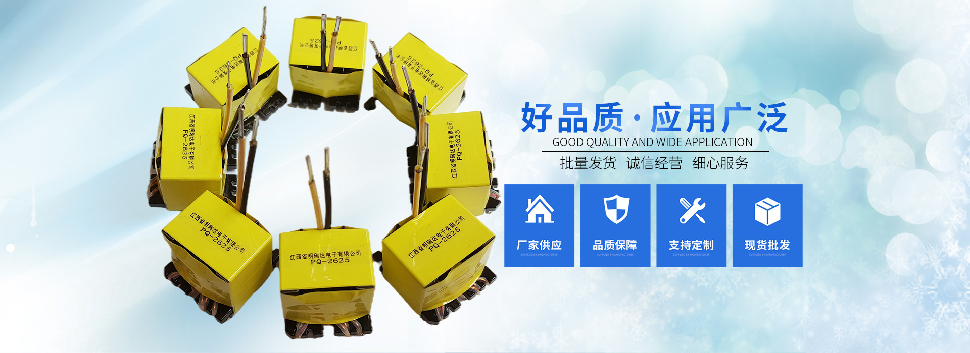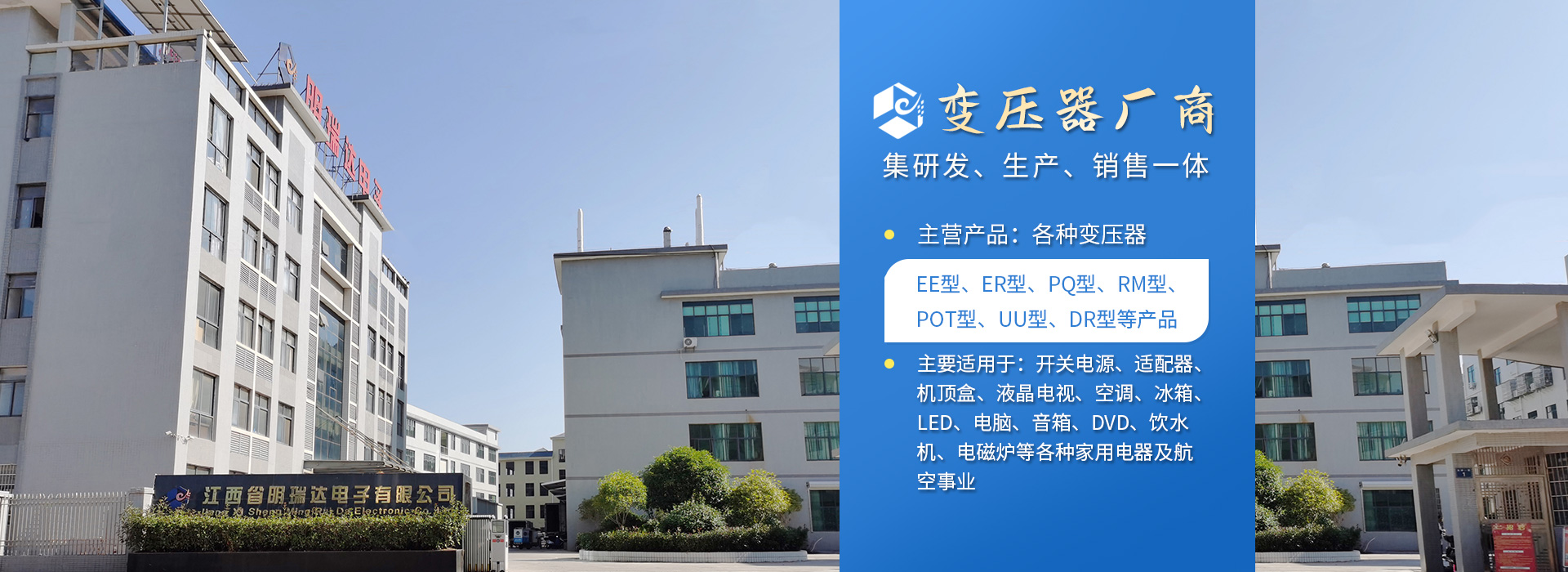 江西省明瑞達電子有限公司座落于江西省贛州市石城縣,是一家研發(fā)、生產(chǎn)、銷售各種變壓器廠商。生產(chǎn)銷售、技術(shù)服務、產(chǎn)品研發(fā)為一體的綜合性企業(yè),主要生產(chǎn)、銷售產(chǎn)品:變壓器(EE型、ER型、PQ型、RM型、POT型、UU型、DR型等產(chǎn)品),主要適用于:開關(guān)電源、適配器、機頂盒、液晶電視、空調(diào)、冰箱、LED、電腦、音箱、DVD、飲水機、電磁爐等各種家用電器及航空、醫(yī)療事業(yè)。